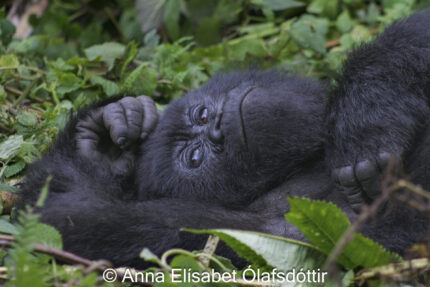 Górillu ungi liggur á meltunni og slakar á. Myndin er tekin 2007 í Úganda.
